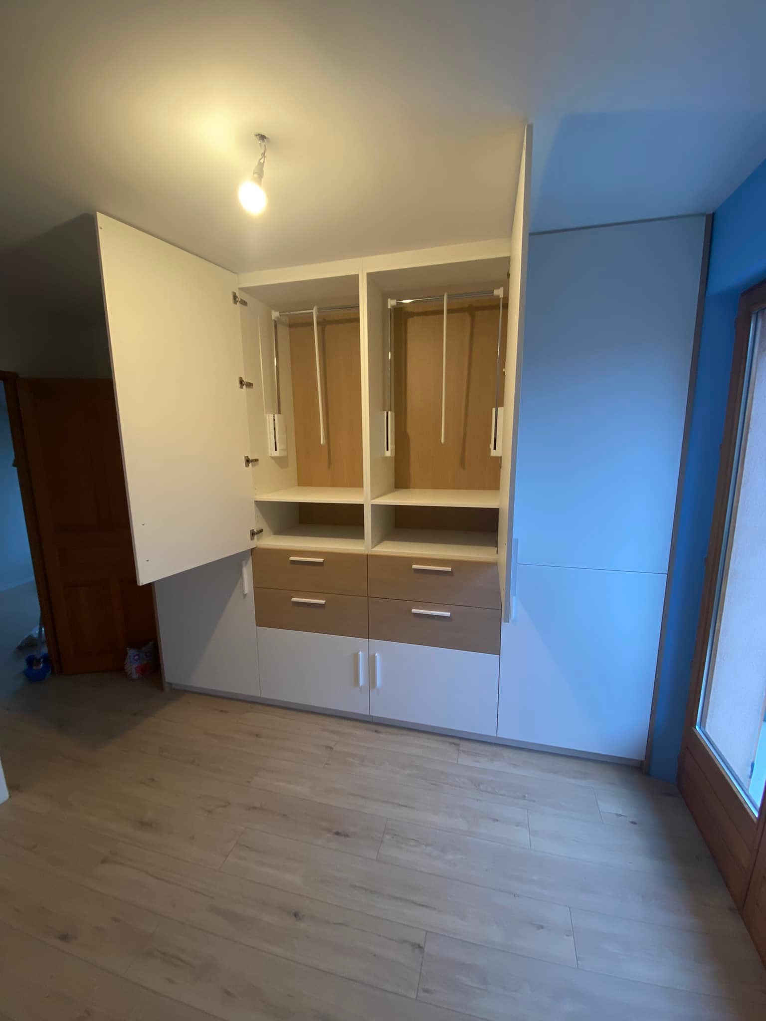 Nous réalisons des dressings sur mesure, fonctionnels et esthétiques, qui optimisent chaque mètre carré de votre chambre :